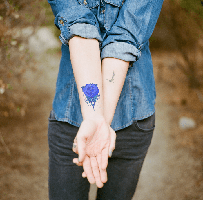 - Par ailleurs, elle voudrait remplacer sur son bras droit le tatouage par un nouveau (modèle fourni), dans une couleur bleutée, légèrement plus bas sur l’avant-bras.